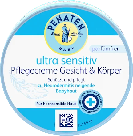 Die PENATEN ultra sensitiv Pflegecreme Gesicht & Körper ist eine parfümfreie Baby Gesichtscreme & Körpercreme, die speziell für Neugeborene entwickelt wurde. Die pflegende Feuchtigkeitscreme ist auf die Bedürfnisse empfindlicher Babyhaut abgestimmt und erhöht den Feuchtigkeitsgehalt der Haut. Die Formel ist ohne Parfüm & Farbstoffe formuliert, um Allergierisiken zu minimieren. Die Hautpflege Creme für Gesicht und Körper eignet sich so wunderbar als Baby Erstausstattung.