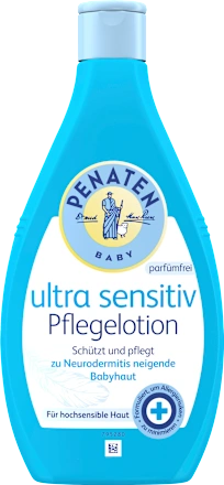 Die Baby Pflegelotion Ultra Sensitiv von Penaten bietet eine sanfte Pflege für hochsensible Babyhaut. Diese parfümfreie Lotion ist von Geburt an geeignet und speziell für die Pflege von zu Neurodermitis neigender Haut entwickelt. Die dermatologisch bestätigte Hautverträglichkeit und die Formulierung ohne Parfüm und Farbstoffe machen sie besonders gut verträglich. Zudem kann die schützende Bodylotion gezielt den Feuchtigkeitsgehalt der Haut erhöhen und für eine sanfte und effektive Pflege sorgen - perfekt für eine schonende und schützende Babypflege.