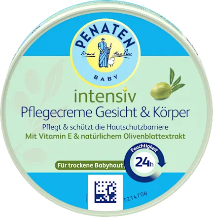 Die Intensiv Baby Pflegecreme Gesicht & Körper von Penaten sollte in der Erstausstattung für Neugeborene auf keinen Fall fehlen. Sie ist mit nährendem Vitamin E und duftendem Olivenblattextrakt angereichert und perfekt auf die Bedürfnisse der Babyhaut angepasst. Die Creme kann sowohl für das Gesicht, als auch für den Körper angewendet werden und spendet wohltuende Feuchtigkeit.